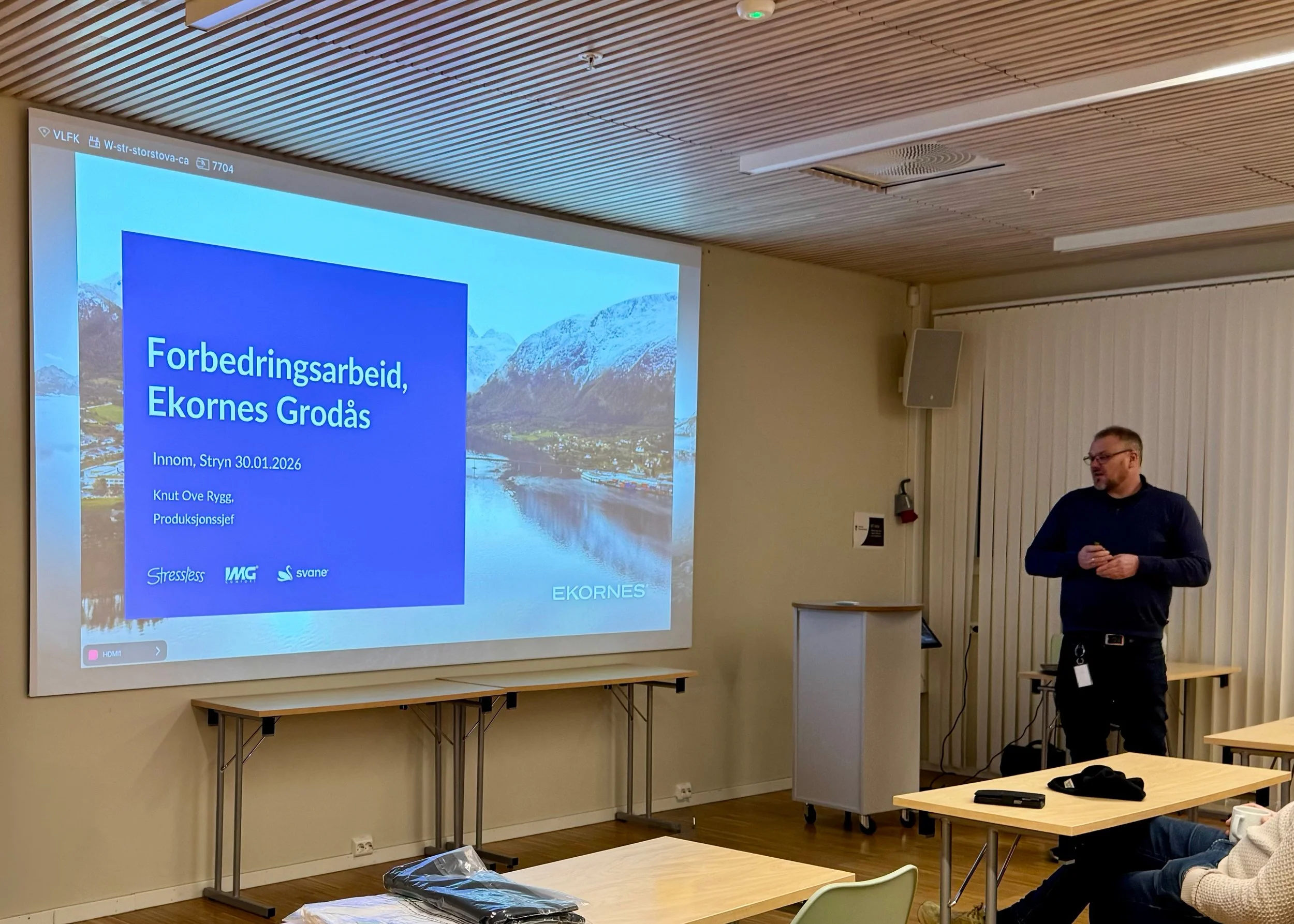 På INNOM fekk deltakarane eit innblikk i korleis Ekornes jobbar målretta med kontinuerleg forbetring i produksjonen. Rygg er produksjonssjef ved Ekornes-fabrikken på Grodås, der rundt 70 tilsette produserer trekomponentar til sofaer og stolar. Ein del av produksjonen går vidare til fabrikkane i Sykkylven, medan resten blir sendt til Ekornes sine fabrikkar i USA.